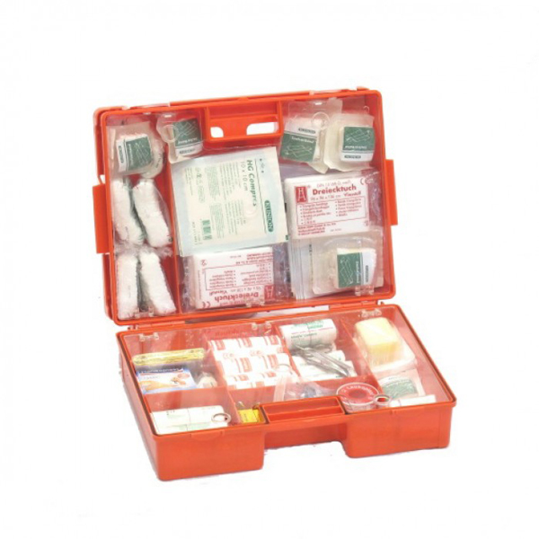 Stevige verbandkoffer met de bekende A inhoud, wordt geleverd met wandhouder. De verbandkoffer A is geschikt voor elk bedrijf met meer dan 10 werknemers, of bedrijven met een hoog bedrijfsrisico.