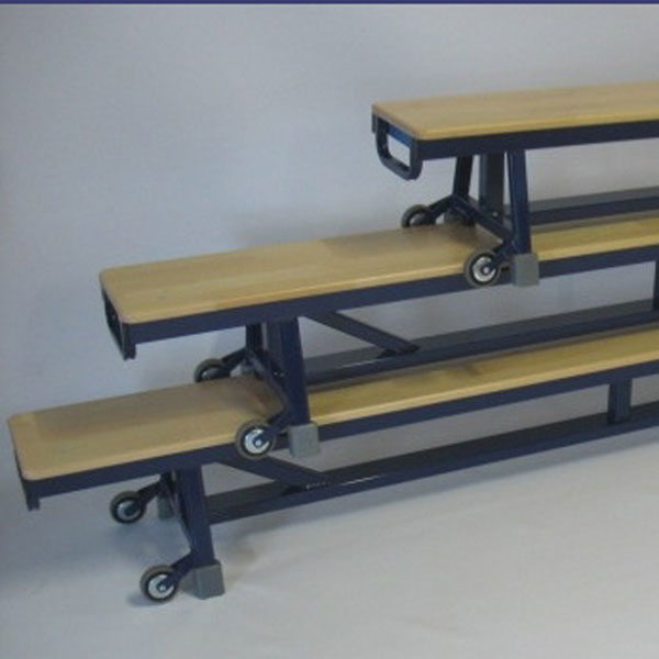 Turnbank met een degelijk metalen frame en geïntegreerde stalen evenwichtslat van 7 cm breed. Staat op 4 rubber voeten. De uiteinden zijn voorzien van beugels. De bank is stapelbaar en voorzien van een verrolinrichting. Wanneer de banken om en om neergezet worden kan een geheel dicht vlak gecreëerd worden. Zithoogte: 31 cm, Breedte: 25 cm, Lengte: 200 cm.
