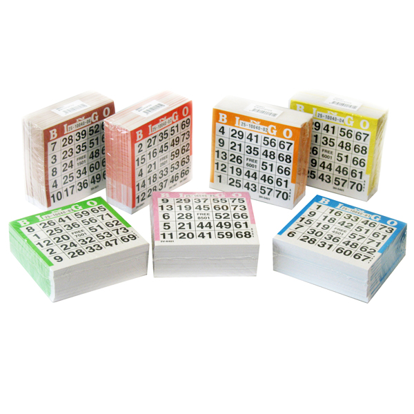 Set bingokaarten van papier voor eenmalig gebruik. Totaal 10.500 vellen in 7 verschillende kleuren. Per 1500 vellen in 1 kleur.