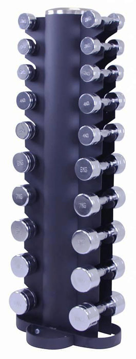 De Dumbbelltoren met chrome dumbbellset (1 t/m 10 KG) bestaat uit een dumbbelltoren (zilver of zwart) en een strakke, hoogglans verchroomde dumbbell sets.