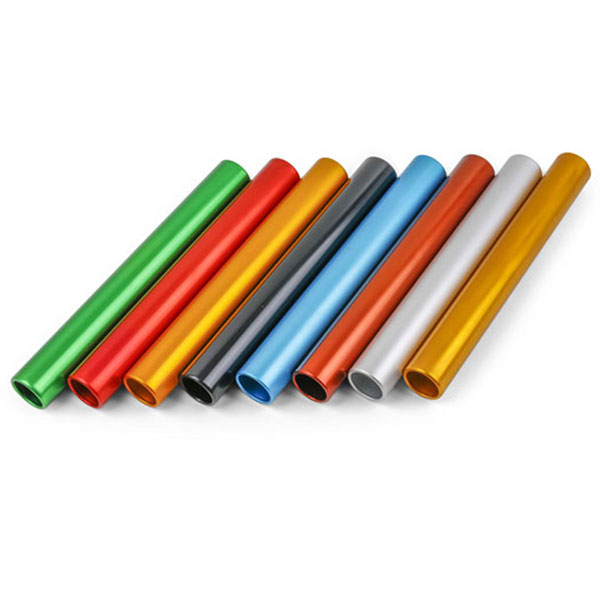 Set van 8 estafettestokjes in verschillende kleuren gemaakt van lichtgewicht geanodiseerd aluminium met de officiële afmeting en gewicht.