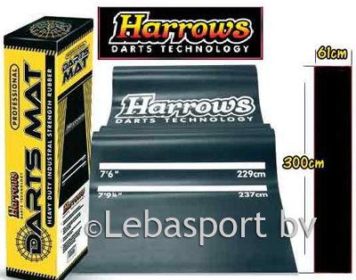 Dankzij deze dartmat sta je op de juiste afstand van het dartbord. Bovenop op de mat zijn de internationale werplijnen aangegeven: 229 en 237 centimeter - overigens ook in inches mocht de voorkeur daar naar uit gaan. De dartmat is gemaakt van rubber en weegt 10 kilogram. Het rubber zorgt ervoor dat de mat goed blijft liggen en niet gaat krullen. Daarnaast beschermt het de vloer tegen afketsende darts.