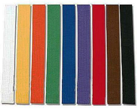 Judobanden. Verkrijgbaar in de kleuren wit, geel, oranje, groen, blauw, bruin en zwart. Lengte 2,80 m.