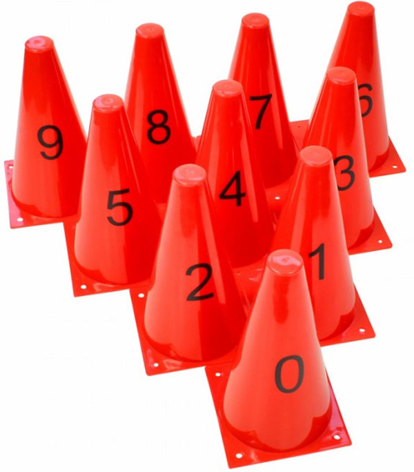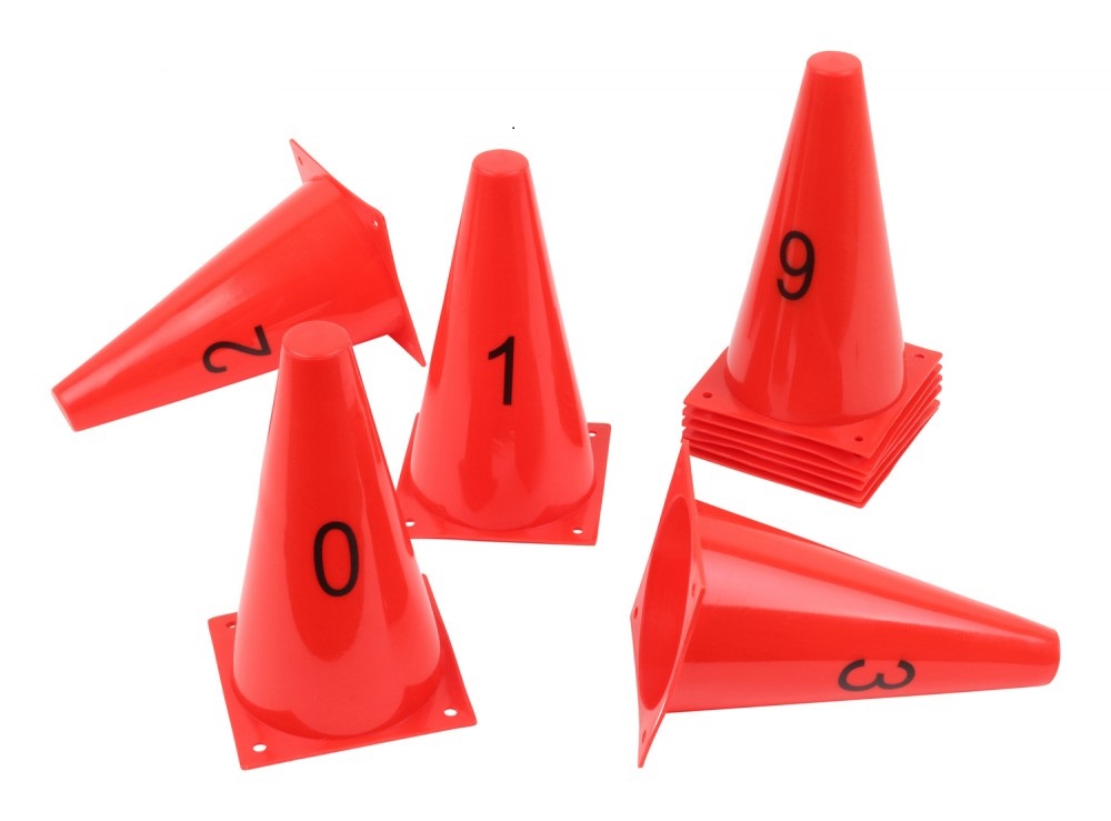 Set van 10 kegels voorzien van nummers 0,1,2,3,4,5,6,7,8 en 9. Afbakenkegels gemaakt van PVC in de kleur oranje/rood.