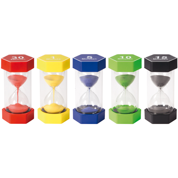 Mag ik nog vijf minuten televisiekijken? De zandlopers laten zien hoe een bepaalde hoeveelheid tijd verstrijkt. Hierdoor ontwikkelen kinderen een gevoel voor tijd en leren ze hoe ze het kunnen organiseren: 3 minuten voor tandenpoetsen, 10 minuten voor leesoefeningen, 15 minuten om te spelen. Elke zandloper bevat gekleurd zand.
