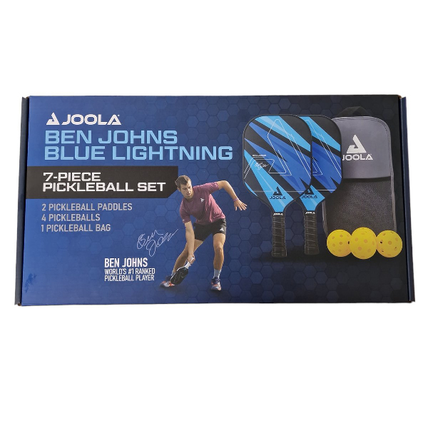 Bovendien hebben de paddles een in het oog springend "Blue Lightning" ontwerp met het iconische JOOLA Trinity-teken en de kenmerkende opdruk van wereldnummer één Ben Johns.