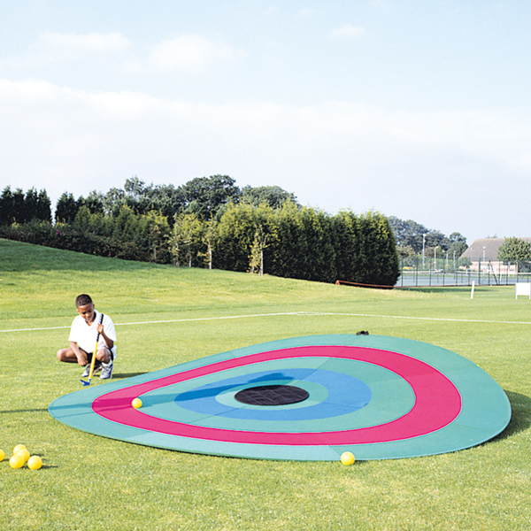 Target doek ontworpen voor golf, maar met wat verbeeldingskracht werkt het ook voor zakwerpen, doelwitten voor frisbees en noem maar op. Speciaal ontworpen Hook-and-Loop-ballen deze blijven plakken als lijm aan het doel, om het scoren gemakkelijker te maken. Plaats het doel eenvoudig op de grond of in de gymzaal, zet het ene uiteinde omhoog, hang het aan een haak. Kan ook in combinatie met Big Red Base Post. Gemaakt van stevig doek over een flexibele draadband om een groot doel te creëren dat in zijn eigen kleine draagtas vouwt. Ballen, Big Red Base en Post niet inbegrepen