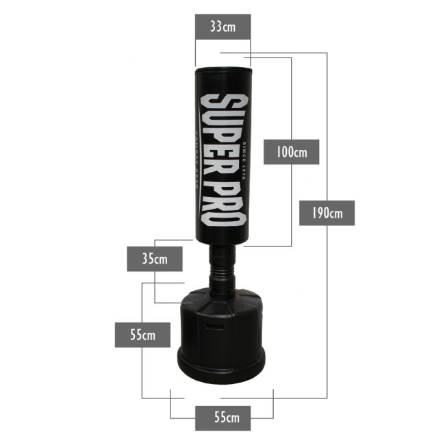 Deze staande bokspaal is uw ideale trainingspartner voor thuis. Het stootvlak is gevoerd met een perfect absorberende foamlaag die uw stoten en trappen reduceert tot een minimum. De stabiele voet kan gevuld worden met zand of grind en krijgt hierdoor een gewicht van maar liefst 150 kg waardoor de voet als een blok op de grond staat en dus niet alle kanten op schuift tijdens uw training. Ook is er een low kick onderdeel(art.code T99/A) leverbaar voor het oefenen van lage trappen (lowkicks).