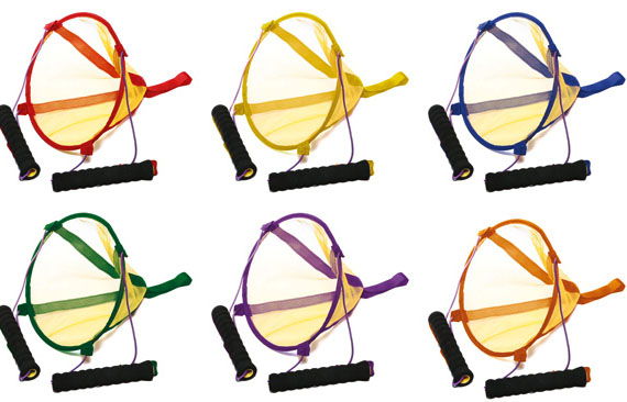 Handvat van ultrafoam met een lengte van 20 cm. Ø hoepel 28 cm. Losse stuks worden geleverd in kleuren assorti. Set van 6 stuks is in de kleuren: rood, geel, blauw, groen, paars en oranje