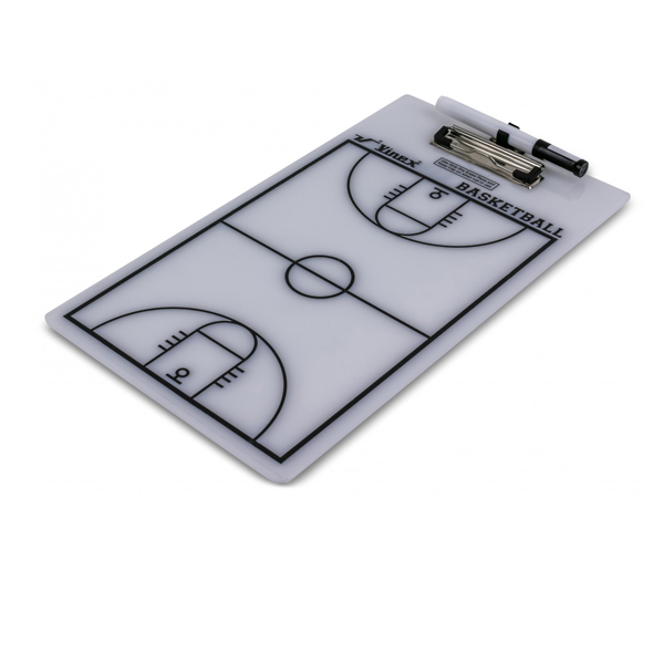 Stevig kunststof weerbestendig coachbord met opdruk van basketbalveld voorzien van een handige clip en een uitwisbare stift. Gemakkelijk mee te nemen door practische formaat. Afmeting 22 x 40 cm.
