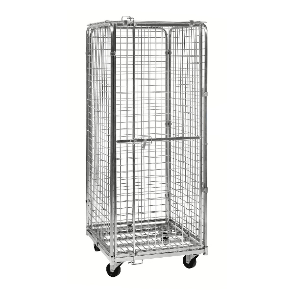 Diefstalbestendige kast van verzinkt staal uitgerust met een deur ontworpen om te worden gesloten met een hangslot (niet meegeleverd) en 4 wielen met een diameter van 100 mm (2 vast + 2 zwenkbaar). Maaswijdte 5x5 cm.