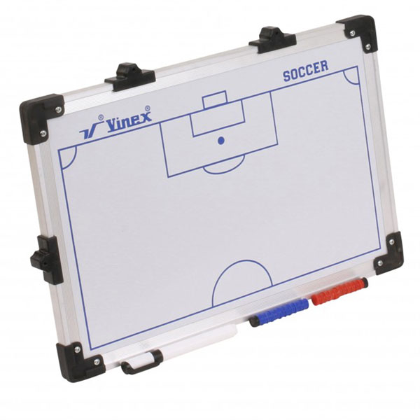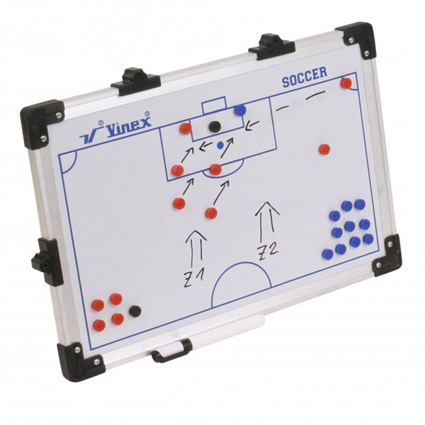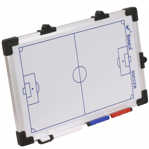 Vintex tactiekbord Voetbal coachbord Voetbal, dubbelzijdig magnetisch tactiekbord. Robuust metalen ontwerp! Afmeting 45 x 30 cm. Twee kanten te gebruiken, volledig voetbalveld en een half voetbalveld. Zeer stevig en mooi afgewerkt bord met aluminiumlijst en 3 kunststof ophangpunten.
