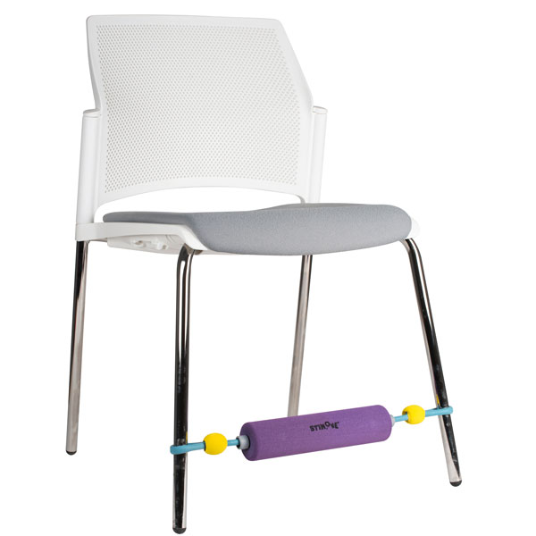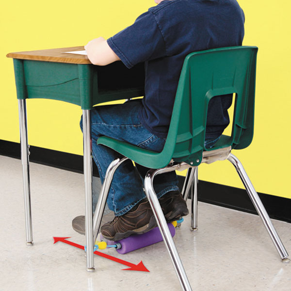 De Voetroller Think-N-Roll kan eenvoudig worden bevestigd aan de voorkant van elke standaard klasstoel en biedt een voetroller voor "drukke" voeten.