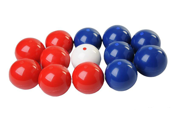 Deze set bestaat uit 6 rode, 6 blauwe en 1 witte doelbal. Dia 86 mm gewicht 300 gram.