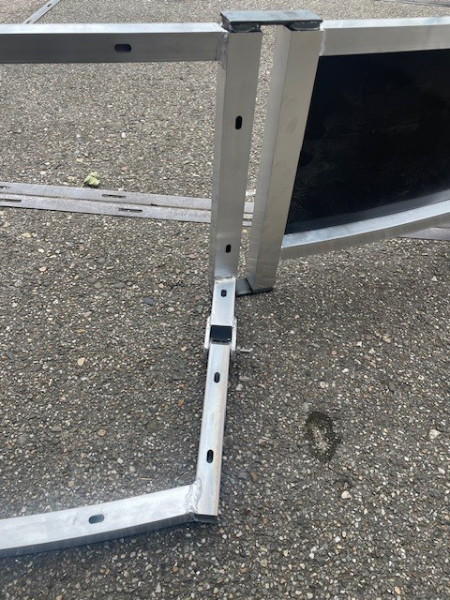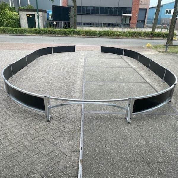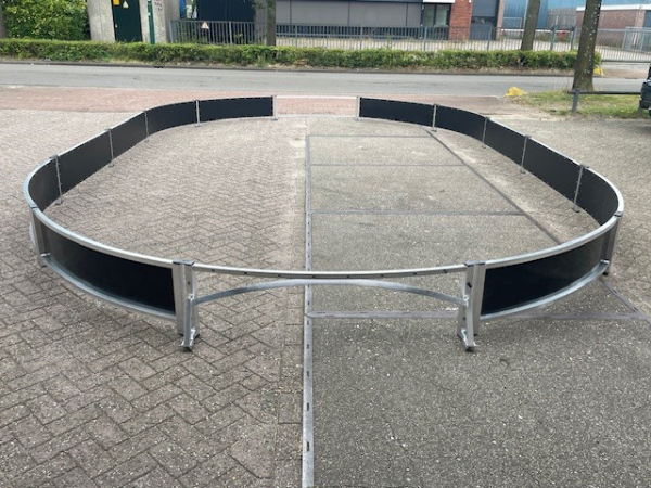 Aluminium pannaveld, eenvoudig te monteren en te vervoeren. Bestaande uit 8 boogstukken en 2 stuks doeltjes (opklapbaar) voor een rondpanna veld van ca. Ø 488 cm, incl. 4 rechte panelen voor veld uitbreiding naar ovaal afm; 488x870 cm.