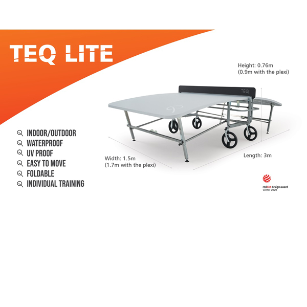 De Teqball® TEQ LITE is een mobiele, lichtere en opvouwbare versie van de Teqball tafel. Hij kan zowel binnen als buiten worden gebruikt. Met zijn 4 wielen en de vouwfunctie is hij perfect om hem op verschillende plaatsen te gebruiken. De afmetingen van de TEQ LITE in uitgevouwen toestand zijn 300 x 170 x 90 cm.